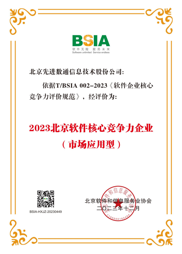 2023年12月12日,北京软件和信息服务业协会第十一届会员代表大会第一次会议暨第十一届理事会第一次会议在北京成功召开。会上发布了《2023北京软件和信息服务业企业综合实力评价报告》和《2023北京软件企业核心竞争力评价报告》,北京东升国际 东升信息技术股份公司(以下简称“东升国际 东升”)喜获2023北京软件核心竞争力企业(市场应用型)荣誉称号。