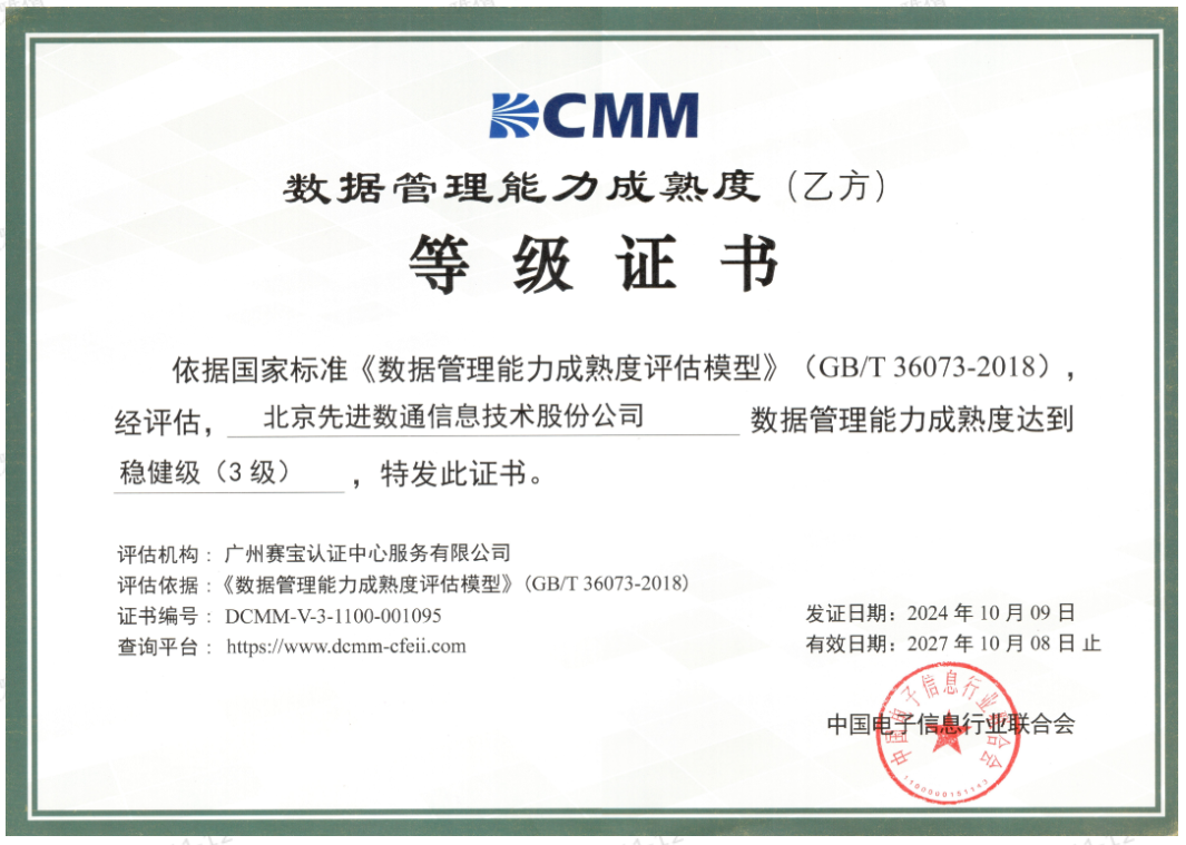 近期,中国电子信息行业联合会公布了最新一批顺利获得数据管理能力成熟度(DCMM)贯标等级认证的企业名单。东升国际 东升成功取得数据管理能力成熟度稳健级(三级)认证。这一认证的取得,标志着东升国际 东升在数据治理体系构建和数据管理与应用能力方面,已经达到了国家权威组织认可的标准。这不仅是对东升国际 东升在数据管理领域专业能力的肯定,也是对其在有助于数字化转型服务和数据驱动决策方面所做努力的认可。