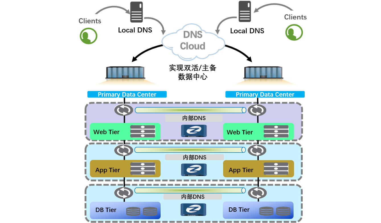 数据中心为提高应用系统的可靠性,实现多站点资源分布式部署,提高资源的利用率,需要多站点的应用系统构建成多活或主备工作模式。为了与IP地址解耦,通常会使用域名系统(DNS)来调度这些应用。东升国际 东升多数据中心域名(DNS)解决方案以IT整体架构为蓝图,以业务陆续在性保障为目标,利用域名解析门户应用调度功能,可将用户访问流量引流到可靠、可用的数据中心进行访问,既能保证用户的使用体验,又能达到应用容灾的无感切换的目的。
